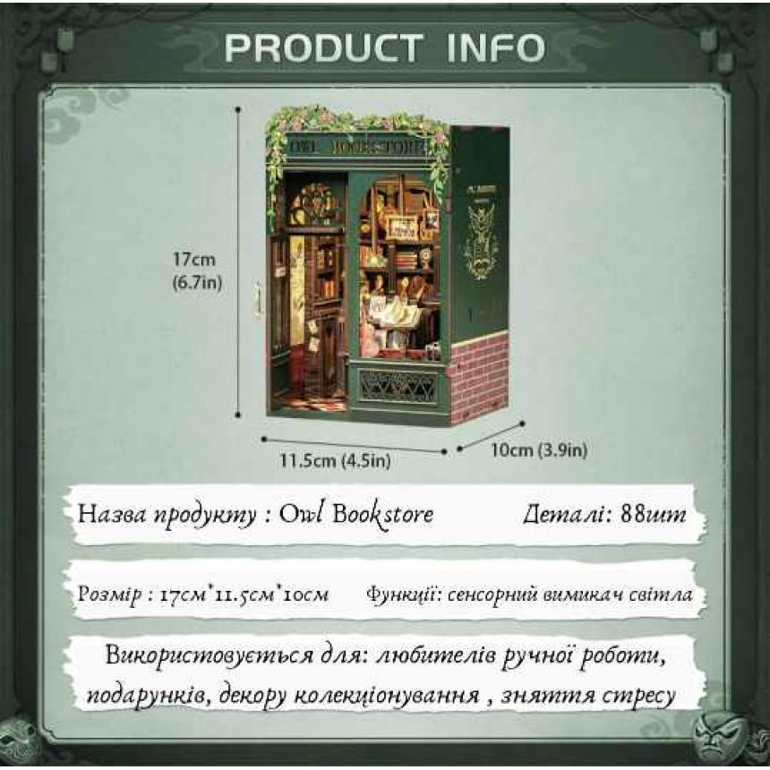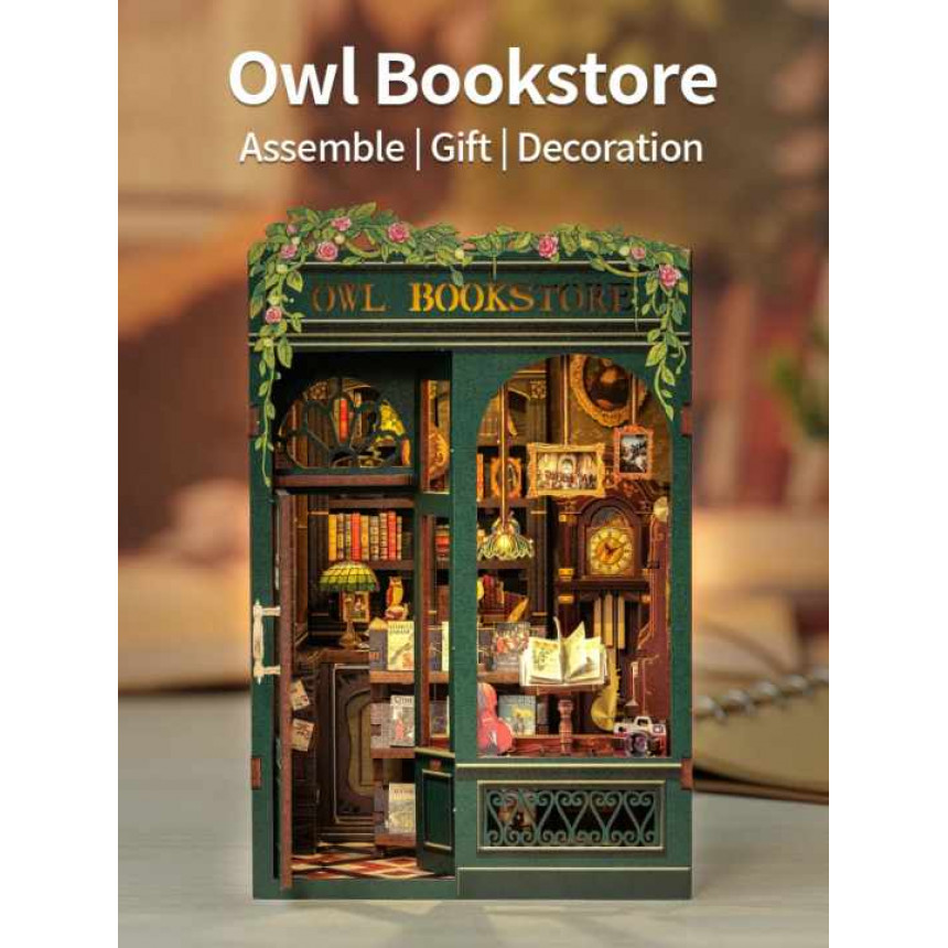 Book Nook Owl Bookstore — це декоративний 3D конструктор у форматі книги, який встановлюється між книгами та створює ефект затишної мініатюрної книжкової крамниці з чарівною атмосферою.