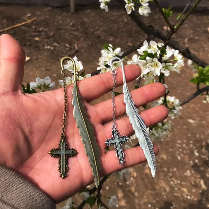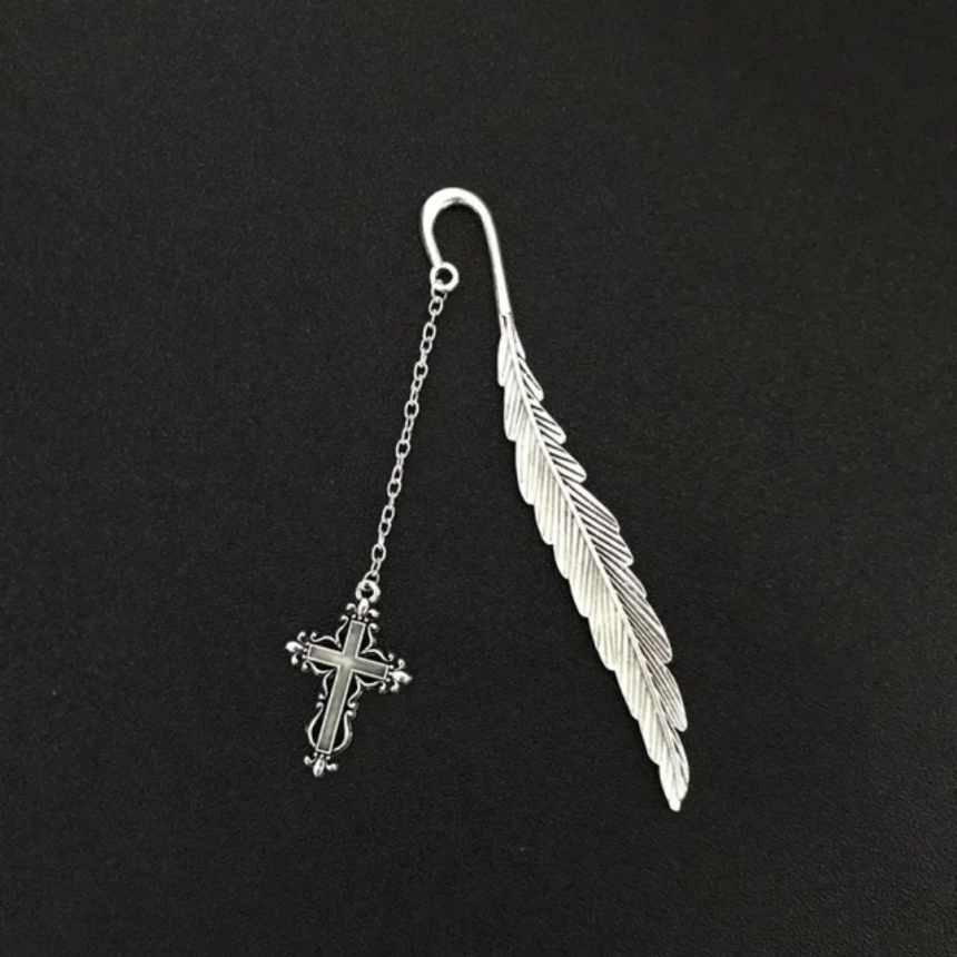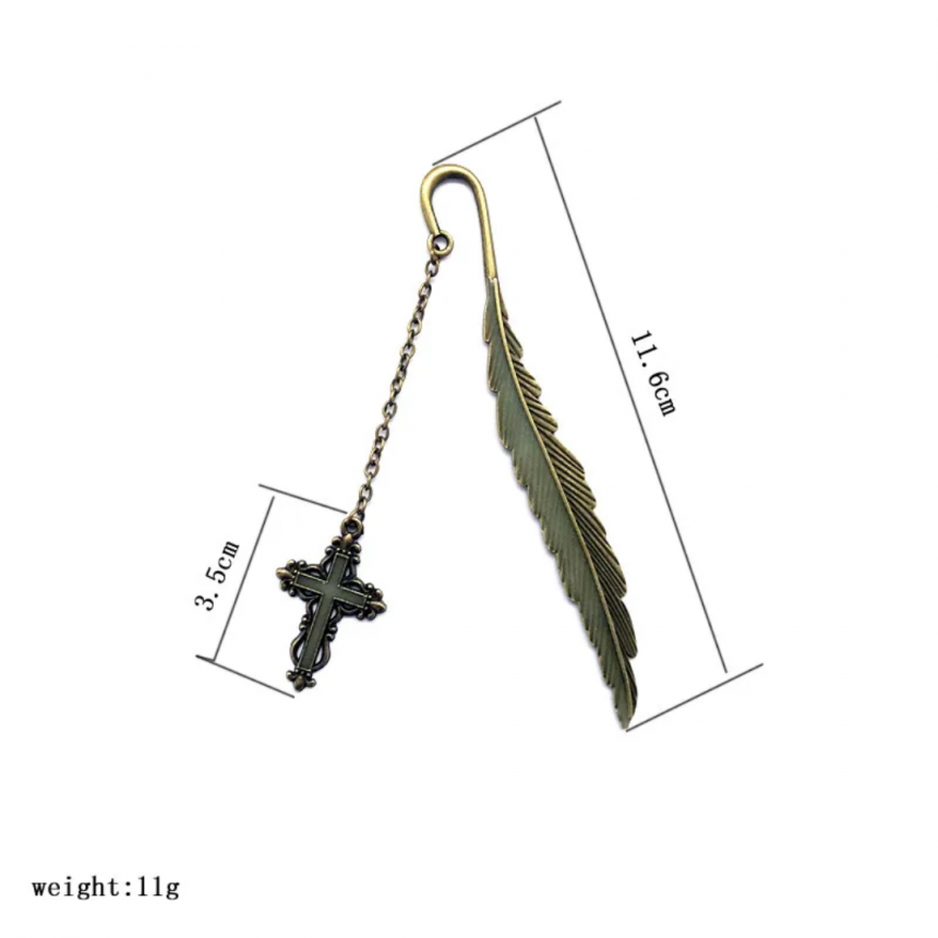 Елегантна металева закладка для книги з підвіскою у формі хреста та декоративним пером, яка стане чудовим аксесуаром для читання або подарунком для книголюбів.